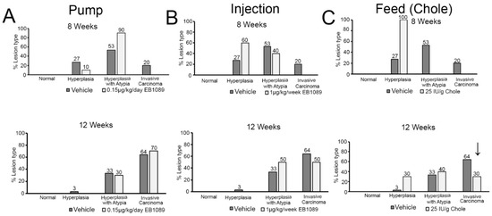 FT histologic/pathologic characterization for normal, hyperplasia, hyperplasia with atypia, and invasive carcinoma at 8 and 12 weeks of age following treatments. The percentage of mice with the different types of FT lesions at 8 and 12 weeks are displayed on the graph: (A) The pump treatment group. (B) The injection treatment group. (C) The feed treatment group. Arrow indicates a 50% reduction in invasive carcinoma between vehicle and Chole in the feed group at 12 weeks.