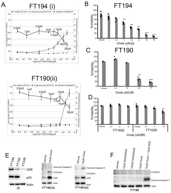 Next, we tested the effect of cholecalciferol on SV40-transformed fallopian tube cells (FT194 and FT190) to see if there was a similar effect to what we observed in the mogp-TAg mice. Chole has been shown to reduce cell viability and induce apoptosis in CaSki cervical tumor cells []. Therefore, we examined whether Chole could exert similar effects in FT190 and FT194. As shown in Figure 6A,B, using the Apotox-Glo Triplex assay, cholecalciferol induced apoptosis and inhibited cell viability in FT194 and FT190. However, it required higher concentrations of Chole to induce apoptosis in FT190. According to MTS assay data, Chole inhibited FT194 proliferation in a dose-dependent manner (Figure 6B) with an IC50 value of 8.5µM. Since it required higher concentrations of Chole to induce apoptosis or inhibit cell proliferation using Apotox-Glo, we performed an MTS assay in FT190 starting at 7.5µM of Chole. While 10µM of Chole had a significant effect on inhibiting FT194 proliferation, this dose had no effect on FT190 proliferation. Based on the growth inhibition of FT190 by 20µM Chole, we estimated the IC50 of about 18µM for Chole in FT190 (Figure 6C). These results were further validated with the scratch-/wound-healing assay showing that chole can inhibit the proliferative capacity of FT194 and FT190. However, there was a more robust effect in retarding the closing of the scratch in FT194 compared to FT190 (Figure S6A–D). Interestingly, primary FTE cells were significantly less sensitive to Chole inhibition of cell proliferation (Figure 6D) compared to FTE cells with inactivated p53. Before conducting the next set of experiments, we performed western blots for p53 expression in FT190, FT194, and FT246 (p53 null). As shown in Figure 6Ei, FT190 and FT194 expressed p53 while FT246 was null. All three cell lines expressed the endogenous vitamin D receptor. From the Apotox-Glo and scratch assays, it appeared that FT194 was more sensitive to cholecalciferol than FT190. Treatment of FT190 with 10µM Chole caused an induction of CYP24A1 protein expression with almost no induction of cleaved-caspase 3, while in FT194, there was a significant induction of cleaved-caspase 3 and no induction of CYP24A1 (Figure 6Eii and Figure 6Eiii, respectively). Vitamin D receptor expression was induced in both cell lines. This suggested that the induction of CYP24A1 in FT190 might be inactivating the calcitriol synthesized from Chole and limiting its biological function. To test this hypothesis, we inhibited CYP24A1 in FT190 with SDZ285428 and then treated these cells with 10µM of cholecalciferol to see if resistance to apoptosis could be reversed. As shown in Figure 6E, the inhibition of CYP24A1 following treatment with cholecalciferol resulted in the induction of cleaved-caspase 3. Taken together, our in vivo and in vitro data suggest that cholecalciferol confers a chemopreventive effect by preferentially targeting abnormal FTE cells via apoptosis, reduction of cell viability, and reduction of proliferative capacity while sparing normal FTE cells. Alterations that may be more typical late in the course of carcinogenesis in FTE or ovarian cancer cells such as activation/overexpression of CYP24A1 can potentially abrogate the cancer-preventive effects of vitamin D. It is intriguing that the inhibition of CYP24A1 may sensitize the FTE to cholecalciferol-induced cell death.