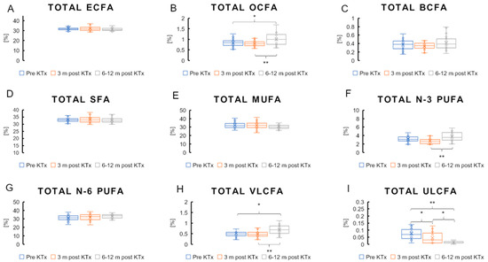 The total amount of very-long-chain FAs (VLCFAs) containing more than 20 carbon atoms did not change significantly 3 months after KTx but increased significantly after 6–12 months (Figure 1H; 0.50% vs. 0.48% vs. 0.67%; p < 0.05). The total amount of ultra-long-chain FAs (ULCFAs) containing 26 or more carbon atoms was significantly reduced 3 months after KTx, and this reduction was further deepened 6–12 months after surgery (Figure 1I; 0.089% vs. 0.052% vs. 0.024%; p < 0.05). The total amount of total MUFAs did not change after transplantation over a shorter and longer time interval (Figure 1E). Among the MUFAs, a significant increase was observed 6–12 months after transplantation for some FAs (C20:1, C22:1 and C24:1), while 18:1 showed a decreasing trend during this period (Table 2). Total n-3 PUFAs increased significantly 6–12 months after KTx after an initial downward trend 3 months after KTx (Figure 1F; 3.22% vs. 2.76% vs. 3.7; p < 0.05). The change in the amount of docosahexaenoic acid (DHA) initially showed a significant decrease at 3 months and then a significant increase at 6–12 months (Table 2). Some n-6 PUFAs behaved similarly: arachidonic acid (ARA) and dihomo-γ-linolenic acid (DGLA) decreased significantly 3 months after KTx and then increased significantly 6–12 months after KTx. Linoleic acid (LA), however, increased significantly in the shorter period after treatment (3 months), but after 12 months there is only a trend towards an increase in LA compared to the preoperative samples (Table 2). Total n-6 PUFAs did not change significantly either 3 or 6–12 months after KTx (Figure 1G).