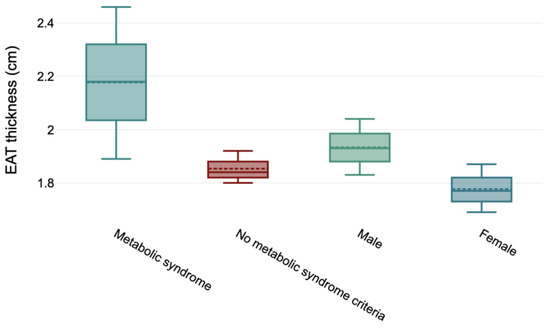 Association between epicardial adipose tissue (EAT) thickness values, sex, and metabolic syndrome according to 95 Intervale Confidence, median (line) and mean (dotted line).