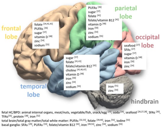 Different maternal nutrition components during pregnancy have potential impacts on various regions in the offspring brain, including frontal lobe, parietal lobe, occipital lobe, temporal lobe, hindbrain, basal ganglia, and the whole brain. The numbers in the figure refer to the referenced articles.