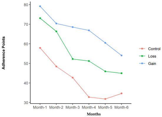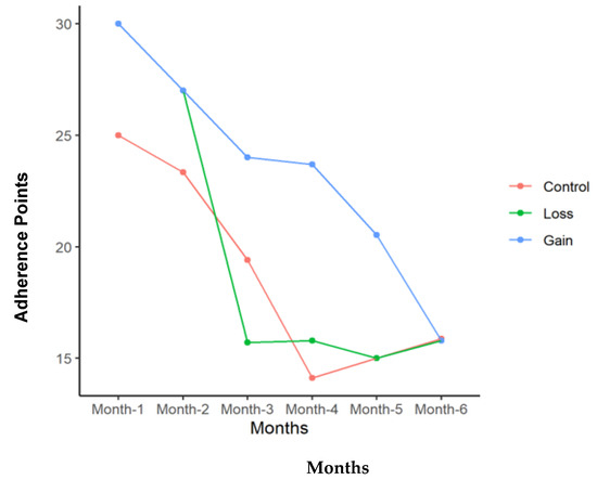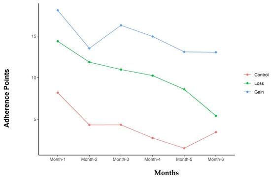 Total adherence points for each of the groups with time in months of study participation.