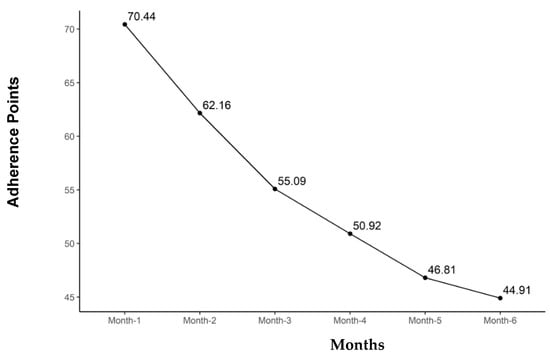 Figure 5 illustrates the total points for all the groups combined over the study period. Total adherence points declined overall and within all groups over the 6 months (p < 0.001), with the mean total adherence for all groups combined dropping from 70.4 ± 24.5 points to 44.9 ± 29.3 points.