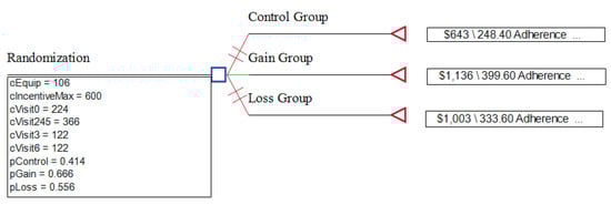 For the economic evaluation, a decision tree for the study was created using TreeAge Pro Version 2023 software (Copyright 1988–2023 TreeAge Software, LLC, Williamstown, MA, USA). The provider costs of visits 2, 4, and 5 were bundled together, as the probability of each of the visits was assumed to be equal for all branches in the analysis. A cost-effective analysis was carried out using the actual study equipment costs (incentives, Fitbit, and scale) and values of physician, dietitian, and exercise visits estimated via posted Medicare reimbursements. Three-way sensitivity analyses were performed, varying the probability of adherence in the CG, LG, and GG by 10% higher and lower than the values observed during the trial.