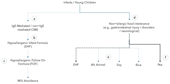 Research suggests that 75% of children outgrow their CMPA by age five, but those still allergic require long-term management by avoiding cow’s milk proteins in food and beverages [7]. Current clinical practice steers practitioners to prescribe a hypoallergenic formula even when a child is not diagnosed with a CMPA (Figure 1). Figure 1 illustrates common clinical practices for prescribing formulas to infants and children, and it was created using the author’s experience