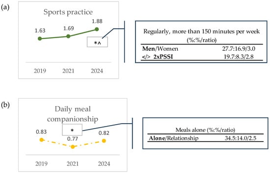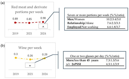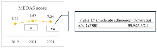 3.3. Sociodemographic Profiles of the Studied Cohorts for Lifestyle and Mediterranean Diet Adherence Parameters Which Were Significantly Different among the Years 2019, 2021, and/or 2024