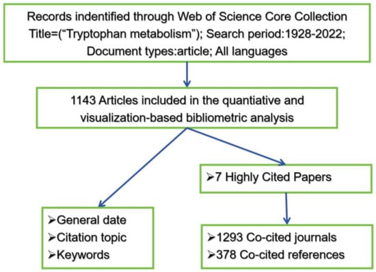 The term “tryptophan metabolism” as a title was searched in the Web of Science Core Collection database (WOS) until 7 July 2023. Articles up to 31 December 2022 were refined and used for scientometric analysis. The downloaded contents include 1143 articles, 7 highly cited articles, and their 378 references and 1293 citations. The methodology for retrieving and gathering data is illustrated in Figure 1. The record contents contain full records and cited references in plain text file format.