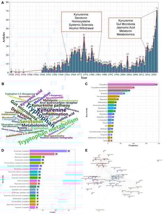 A total of 1143 papers about tryptophan metabolism were obtained from WOS, covering 1928 to 2022. Figure 2A depicts an increasing publication number of tryptophan metabolism. In 1928, Robson published two articles on the formation of kynurenic acid (KYNA) from tryptophan, shedding light on tryptophan metabolism [14,15]. From 1964 to 1984, there is a small peak in publication number, with a focus on “Kynurenine”, “Serotonin”, “Homocysteine”, “Systemic sclerosis”, and “Alcohol withdrawal”. Furthermore, from 2015 to 2022, the analysis reveals a significant growth trend, with a focus on “Kynurenine” and “Gut microbiota”, “Jasmonic acid”, “Melatonin”, and “Metabolomics”. Publications increased from eight in 2008 to seventy-one in 2022, with nearly 56.80% published in the last five years. These studies provide a crucial foundation for understanding the physiological function of tryptophan metabolism and its relationship with diseases.