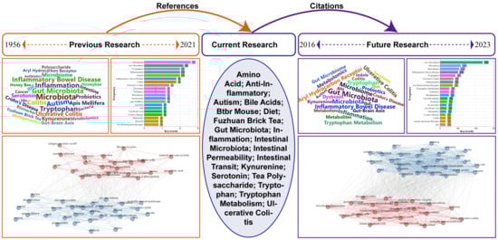 Figure 3 provides a keyword analysis of highly cited articles and their references and citations. The left figure (orange) analyzes references of highly cited papers from 1956 to 2021, reflecting the historical research focus on tryptophan metabolism. The right (purple) analyzes citations of highly cited papers from 2016 to 2023, providing insights into future research trends. The middle (blue) summarizes the critical keywords extracted from the highly cited papers, bridging previous and future research. Exploring and summarizing previous theories provides an essential guide for future studies of tryptophan metabolism.