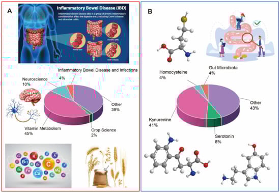 The 1143 papers retrieved from WOS were identified and downloaded with their “Citation Topic Meso” and “Citation Topic Micro” data, and the macro and micro citation topics were detailed separately for the first five topics. Figure 4A is the meso view of the citation topic. “Vitamin Metabolism”, “Neuroscience”, and “Inflammatory Bowel Diseases & Infections” belong to the macro topic “Clinical & Life Sciences”, in which vitamin metabolism accounts for up to 45%. The second category, namely “Crop Science” and “Dairy & Animal Sciences”, falls under the umbrella of “Agriculture, Environment & Ecology”. It is indicated that tryptophan metabolism plays a crucial role in the human body and holds significant implications in agriculture and ecology. In Figure 4B, the top five micro topics are depicted, namely “Kynurenine”, “Serotonin”, “Homocysteine”, “Gut Microbiota”, and “Melatonin”, which belong to the meso topics “Vitamin Metabolism”, “Neuroscience”, “Vitamin Metabolism”, “Inflammatory Bowel Diseases & Infections”, and “Sleep Science & Circadian Systems”, respectively. These meso topics fall under the broader “Clinical & Life Sciences” category. In the micro topic analysis, “Kynurenine” had the highest percentage at 41%, followed closely by “Gut Microbiota” and “Melatonin”, suggesting the three metabolic pathways. The KYN pathway is crucial in immune responses, regulating inflammation and excitatory neurotransmission in vivo. The serotonin pathway may regulate adaptive responses to environmental changes, affecting cognition, eating behavior, and sleep. The gut microbiota can convert tryptophan directly into different indole molecules. This conversion helps maintain intestinal homeostasis by regulating the expression of pro-inflammatory and anti-inflammatory cytokines [5]. Overall, tryptophan metabolism has broad implications in various pathophysiological processes, and thus, understanding the mechanisms and targets of tryptophan metabolism pathways is necessary to provide valuable insights for developing targeted therapeutics for related diseases.