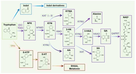 Flowchart of the three tryptophan metabolic pathways (NFK, N-formyl kynurenine; KYN, kynurenine; KYNA, kynurenic acid; 3-HK, 3-hydroxy-kynurenine; XA, xanthurenic acid; AA, anthranilic acid; 3-HAA, 3-hydroxy anthranilic acid; QA, quinolinic acid; NAD+, N-methyl-D-aspartic acid; 5-HT, 5-hydroxytryptamine; 5-HTP, 5-hydroxytryptophan; 5HIAA, 5-hydroxyindole-3-acetic acid).