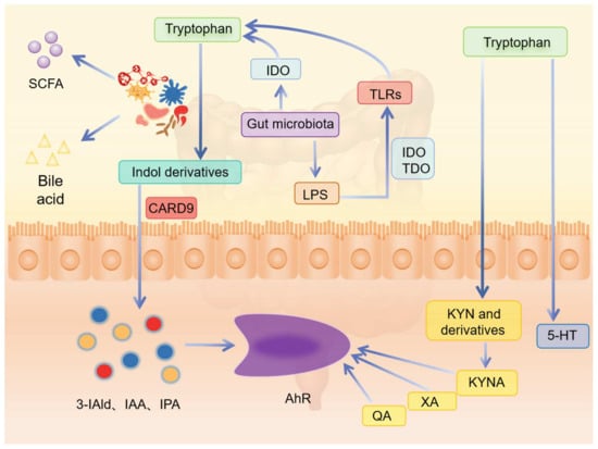 Influence of host intestinal flora on tryptophan metabolism (SCFA, short chain fatty acid; IDO, indoleamine-2, 3-dioxygenase; TDO, tryptophan-2, 3-dioxygenase; TLRs, toll-like receptors; CARD9, caspase recruitment domain-containing protein 9; LPS, lipopolysaccharide; 3-IAld, indole-3-acetaldehyde; IPA, indole-3-propionic acid; IAA, indole-3-acetic acid; AhR, aryl hydrocarbon receptor; KYN, kynurenine; KYNA, kynurenic acid; QA, quinolinic acid; XA, xanthurenic acid; 5-HT, 5-hydroxytryptamine).