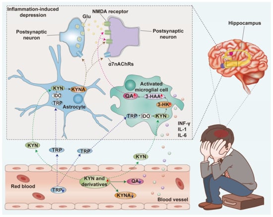 As is well known, immune-mediated inflammatory diseases coexist with depression [95,96]. Research has shown that the KYN metabolic pathway has been implicated in the development of depression caused by inflammation by affecting the brain’s glutamate receptor [97,98]. Recently, researchers have begun to focus on the metabolic enzymes and metabolites of KYN in the study of inflammation-induced depression. Inflammatory cytokines and peripheral inflammatory stimuli such as TNF, IFN-γ, and LPS convert tryptophan into KYN by activating IDO. During the depression, enzymes IDO and TDO are over-activated and can be used to treat depression [99]. Inhibiting the activation of the KYN metabolic pathway in mice by inhibiting IDO can reverse the depression-like behavior induced by LPS [100]. Excessive production of pro-inflammatory cytokines in depression induces IDO enzymes and promotes the KYN pathway, thereby reducing the activation of the 5-HT pathway [101]. In addition to IDO and TDO, other KYN metabolic enzymes are associated with depression, including KAT activity, KMO activation, KMO, and KAT III single-nucleotide polymorphism [102,103]. In addition, a neuroprotective compound is metabolite KYNA, while its downstream product QA is a neurotoxic compound. KYNA is an agonist of the NMDA receptor, while QA is an NMDA receptor antagonist. Blocking the NMDA receptor can reduce depression-like behavior induced by lipopolysaccharide [104]. In humans, plasma–KYN metabolites may mediate inflammation-related depression symptoms through CNS-KYN metabolites, and CNS-KYN metabolites can serve as intervention targets for peripheral KYN metabolism, inflammation, and KYN transport to the brain [105]. Studies have found that QA and KYNA, metabolites of the KYN pathway, have neural activity, and they are hot molecules in the mechanism of inflammation-induced depression in recent years (Figure 8) [106]. Inflammation-induced depression is hypothesized to be related to a reduction in the KYNA/QA ratio, leading to an imbalance in neuroprotection and neurotoxicity that potentially affects brain structure and function [107]. QA mainly exists in the forebrain. In the CNS-KYNA metabolism process, the rate of 3-HAA converting QA is much higher than that of L-KYN metabolizing QA, making it easy for QA to accumulate in the brain region. Elevated QA levels can decrease dopamine, choline, and γ-aminobutyric acid (GABA) levels [108,109,110]. At the same time, continuous stimulation of NMDA receptors by QA can damage corresponding neuronal cells, leading to depression [111]. Nevertheless, ketamine, an NMDA receptor antagonist, can act on brain microglia and reduce the production of QA while antagonizing the effect of QA. In drug-resistant depression, baseline KYNA/QA can be used to predict ketamine response [112]. Nevertheless, ketamine is addictive, and it is limited to further use. In addition, hippocampal damage, which affects both neurons and glial cells, may be a mechanism of depression [113]. Hippocampal atrophy may be related to the imbalance of KYNA/QA [114]. Qualified people responsible for training (QPRT) have low activity in the hippocampus, and the hippocampus has difficulty metabolizing QA, increasing its susceptibility to damage. Wang et al. found that albiflorin can treat mouse models of olfactory bulbectomy (OBX), chronic unpredictable mild stress (CUMS), and lipopolysaccharide (LPS)-induced depression. Albiflorin normalizes metabolic dysregulation of phospholipid metabolism by inhibiting hippocampal cytoplasmic phospholipase A2 (cPLA2). In addition, inhibition of cPLA2 overexpression by albiflorin corrected the aberrant kynurenine pathway of tryptophan metabolism via the cPLA2-protein kinase B (Akt1)-indoleamine 2, 3-dioxygenase 1 regulatory loop and guided tryptophan catabolism to promote more significant hippocampal 5-HT biosynthesis [115]. Therefore, the above evidence suggests that the KYN pathway is crucial for depression and is a potential therapeutic target. It is thought that chronic inflammation causes over-activated IDO in the body and brain. Over-activated IDO leads to decreased KYN levels, producing excessive QA and less KYNA in the brain. The over-accumulation of QA damages neurons, leading to inflammation-induced depression. Maintaining KYNA-AQ balance is crucial for physiological homeostasis and preventing the development of depression.