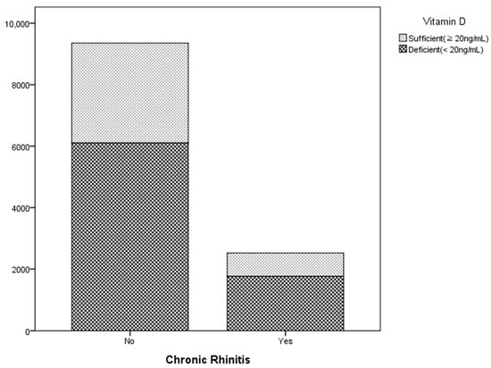 Among the 12,654 participants included in this study, 2668 (21.0%) reported having chronic rhinitis, while 9986 (78.9%) did not (Table 1). There was a significant difference in age distribution between the two groups (p < 0.001). Participants with chronic rhinitis were more prevalent in the 40–49-year age group (29.5%), with a decreasing prevalence observed in older age groups. Additionally, hypertension was significantly more common in individuals without chronic rhinitis (33.2%) compared to those with chronic rhinitis (30.3%) (p = 0.003). Notably, the vitamin D levels were significantly associated with chronic rhinitis (p < 0.001) (Figure 1); participants with chronic rhinitis had a higher prevalence of vitamin D deficiency (<20 ng/mL), at 69.9%, compared to 65.2% in those without chronic rhinitis. In contrast, other factors did not show statistically significant associations with chronic rhinitis.
