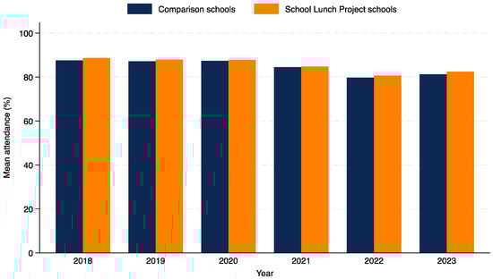 Mean per cent attendance for School Lunch Project and comparison schools, 2018–2023.