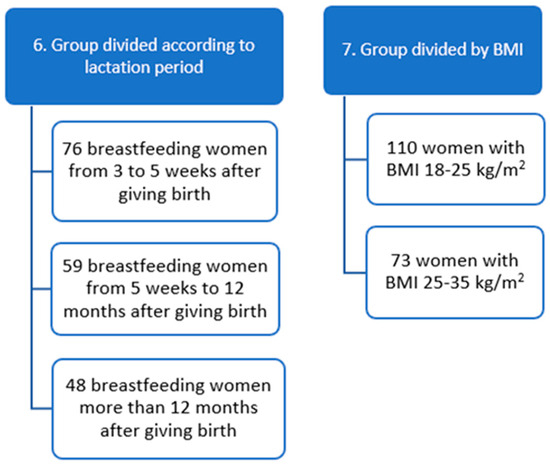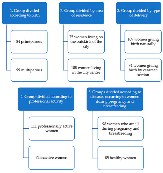 In the entire study group (n = 183), there were 84 primiparous and 99 multiparous women (Figure 1). Another variable is the area of residence. Women living on the outskirts of the city (n = 75) were selected for living in single-family houses or small, single blocks of flats near forests, parks, and far from frequently used roads. The second group of women (n = 108) consisted of study participants living in districts with high and medium population density, living in blocks of flats on frequently used streets. This study excluded women after surgical delivery (forceps, vacuum). However, out of 183 women, 109 women gave birth naturally and 74 women gave birth by cesarean section. Another variable is professional activity: 111 professionally active women and 72 professionally inactive women were distinguished. The study group included 85 healthy women and 98 women who were ill during pregnancy and breastfeeding. The comorbidities during pregnancy and lactation were mainly such diseases as thyroid diseases, gestational diabetes, and hypertension. The patients were under strict medical supervision and followed the recommendations. Patients with hypertension and thyroid diseases were treated with pharmacological agents, while the group of patients with gestational diabetes used diet therapy. The study group was also divided depending on the lactation period, and the following were distinguished: 76 breastfeeding women from 3 to 5 weeks after giving birth, 59 breastfeeding women from 5 weeks to 12 months after giving birth, and 48 breastfeeding women more than 12 months after giving birth. The last variable studied was the BMI of breastfeeding women. The group included 110 women with a BMI of 18–25 kg/m2 and 73 women with a BMI of 25–35 kg/m2.
