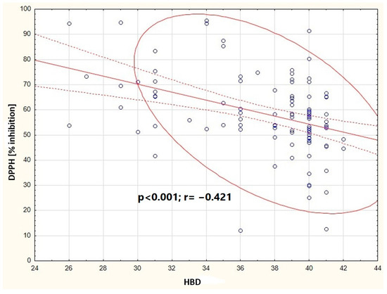 Graphic representation of the correlation between DPPH in milk samples from the multiparous women and the HBD (y = 117.964 − 1.5919x). Circle—prediction elipse (95%), dotted line—confidence interval limit, solid line—regression line, dots—data point.