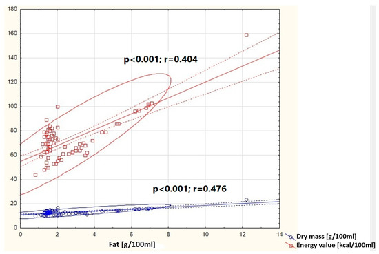 In the group of women giving birth naturally, positive correlations were shown between the concentration of fat in milk and the dry matter content (p < 0.001) and the caloric value of milk (p < 0.001) (Figure 4).