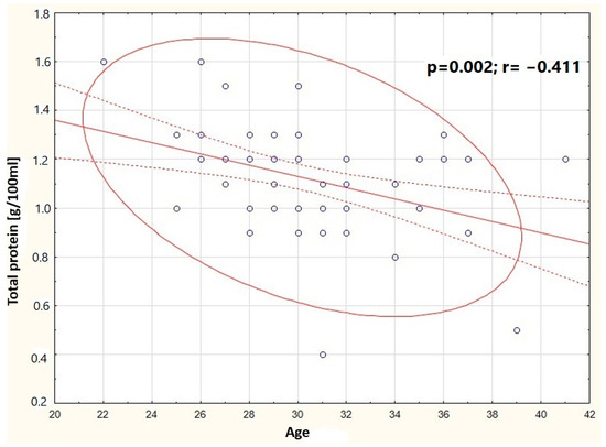 Graphic representation of the correlation between total protein concentration in milk samples from women breastfeeding from 5 weeks to 12 months and the mother’s age (y = 1.8221 − 0.0231x). Circle—prediction elipse (95%), dotted line—confidence interval limit, solid line—regression line, dots—data point.