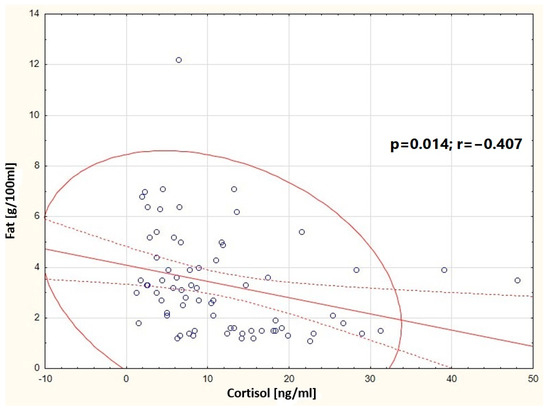 Graphic representation of the correlation between cortisol concentration in milk samples from professionally inactive women and fat concentration (y = 4.0735 − 0.0641x). Circle—prediction elipse (95%), dotted line—confidence interval limit, solid line—regression line, dots—data point.