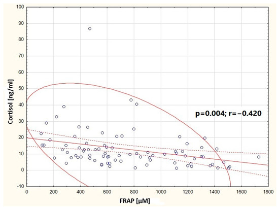 Graphic representation of the correlation between cortisol concentration in milk samples from healthy women and FRAP (y = 19.8395 − 0.0093x). Circle—prediction elipse (95%), dotted line—confidence interval limit, solid line—regression line, dots—data point.