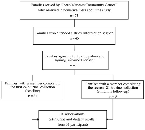This fluoride study was nested in the parent study “Effect of community-based aromatic herb urban gardens on sodium intake and excretion”, which aimed at testing the effect of the implementation of community-based aromatic-herb urban gardens for the substitution/reduction of salt intake; with details published elsewhere [18]. The flowchart in Figure 1, depicts the process of recruitment and final study sample. Briefly, data collection was conducted from January 2022 to June 2022 in the Community Center “Centro Ibero-Meneses” in the neighborhood of Santa Fe, Mexico City. The community center is open to provide assistance to all community member, including individuals with medically managed metabolic disorders, including Type II Diabetes Mellitus, hypertension, and dyslipidemia, who do not have complications such as chronic kidney disease or require dialysis. Therefore, individuals with medical conditions were not excluded from participation. Of the 50 individuals who were invited to join, 35 agreed to participate and signed the informed consent or assent (in the case of minors). Ethical approval of the study was granted from the Ethics Commission and the Academic Council of Universidad Iberoamericana with the number 120/2021. All participants were women aged 14–65, with an average of 44 (±13 years); and 91% of them were primarily responsible for food preparation in the household. A total of 31 participants collected 24-h urine and dietary recalls at baseline, but only 9 were willing to provide urine samples and questionnaires 3 months later, after the intervention, for a total of 40 complete observations (dietary recalls + 24-h urine collections).