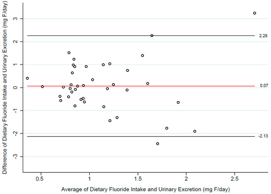 Exploratory statistics revealed that in the sample, the dietary intake of F and its urinary excretion did not follow a linear relationship, and both variables were found to be independent (Spearman’s rho: −0.25; p = 0.12). We therefore explored whether estimates of dietary F intake from the 24-h recall, and urinary F levels agreed with one another, using the procedure by Bland and Altman (Figure 2). Using this method, we found that dietary F intake levels estimated with the 24-h dietary recall may be 2.26 mg above or 2.13 mg below urinary F levels, with better agreement when F levels are at values below 1.5 mg/day.