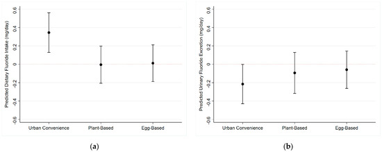 Effect of dietary patterns on the 50th percentile of dietary fluoride intake (95% Confidence Intervals: (a) Dietary Fluoride Intake; (b) Urinary Fluoride Excretion.