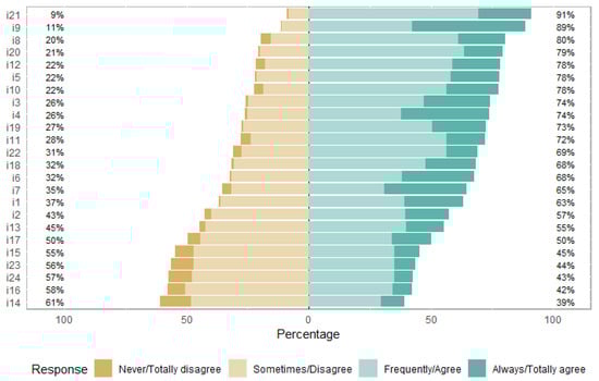 The answers to the items are shown in Figure 1. The majority of the participants (91%) totally agreed with i21, which is “I am aware of the time of year of each food”. The item most disagreed (61%) with was i14, which is “I control the calories and/or other nutritional characteristics of the food I eat daily”.