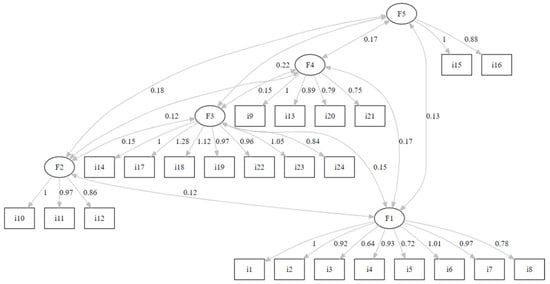 The goodness of fit index for the CFA analysis (five factors and 24 items) is presented in Table 2, and the coefficients for the full model are presented in Figure 2.