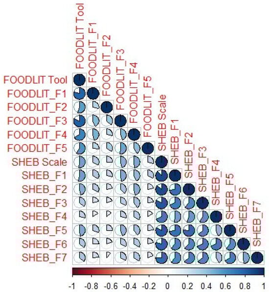 To assess concurrent validity, correlational analysis between the FOODLIT-Tool and the SHEB Scale was conducted and is reported in Figure 3. Positive correlations were observed between the FOODLIT-Tool factors and the SHEB Scale sub-factors (p < 0.05). The strongest associations were between the FOODLIT-Tool and the SHEB Scale (r = 0.518, p < 0.001) and the FOODLIT-Tool and the SHEB_F1 factor (r = 0.528, p < 0.001).