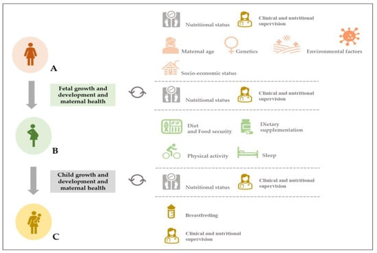 General framework related (but not limited) to women’s nutritional status before (pink images) and during (green images) pregnancy ((A) and (B), respectively) and postpartum (yellow images) (C), and other potential variables influencing fetal and child growth and development, respectively (adapted from Silva and Rodríguez, 2022) [5]. An appropriate nutritional status, which is associated with frequent clinical and nutrition supervision, is crucial for the maintenance and the promotion of good health in three important areas of women’s health and well-being (A–C). The maternal age, genetic profile, socioeconomic status, and environmental variables (including the influence of the pandemic caused by COVID-19) may affect maternal health and fetal growth and development (A). In addition, diet and food security, dietary supplementation, as well as the maintenance of an active lifestyle and good sleep hygiene can also be critical during pregnancy and for the child’s growth and development (B). To respond to the woman’s energy and nutritional needs, as well as those of the newborn (C), clinical and nutritional supervision are required to assess the maternal and newborn’s health and well-being.