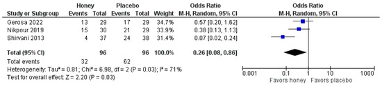 APA StyleFerraz Barbosa, B., de Moraes, F. C. A., Araujo Alves da Silva, B., Bordignon Barbosa, C., Pereira da Silva, I., da Silva, E. R., Barros, J. C. M., Rebouças, L. W. C., dos Santos, N. P. C., & Fernandes, M. R. (2024). The Use of Honey for Cicatrization and Pain Control of Obstetric Wounds: A Systematic Review and Meta-Analysis of Randomized Controlled Trials. Nutrients, 16(2), 185. https://doi.org/10.3390/nu16020185