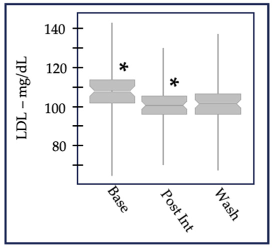 LDL-cholesterol values aggregated at baseline, after 6 weeks of post-intervention, and after a 6-week washout. The change between baseline and post-intervention was statistically significant (designated by *) in both 2013 (p = 1.4 × 10−6 for n = 98) and 2014 (p = 3.4 × 10−3 for n = 107). LDL-c, like other lipid metabolites measured in this study, did not return to baseline values after 6 weeks, suggesting there were long-term effects of the multiple-micronutrient intervention.