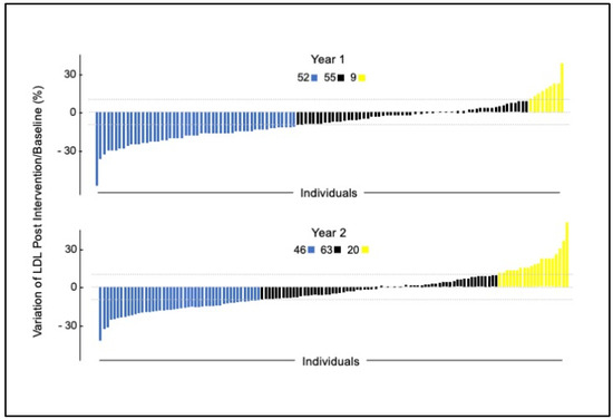 Data aggregated from all participants at each time point demonstrated that the intervention altered the levels of numerous metabolites at the population level (e.g., LDL-C Figure 1). However, metabolite responses were individually unique among study participants. For example, we used the clinical daily variation (+/−~10%) of LDL-c [36] to identify three response groups (Figure 2). Many individuals decreased LDL-c, a second smaller group increased LDL-c, and the majority either decreased or increased LDL-c less than 10%. This overall pattern was repeated in the replication arm. Only about 50% of individuals who participated in the replication experiment responded in the same direction as the first year for virtually any measured variable. We attributed this finding to age stage: 9- to 13-year-old individuals experience growth and sexual maturation which may alter responses to nutrition over the course of a year. Although this study was well powered for many of the variables tested, there were insufficient numbers to conduct subgroup analysis to explain why these groups differed.