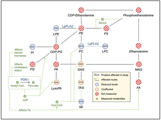 We identified approximately 30 proteins related to lipid metabolism which were specifically impacted by the intervention (based on statistically different levels between V1 and V2; p values after FDR correction < 0.05). These proteins are involved in phospholipid metabolism; glycerophospholipid metabolism; sphingolipid de novo biosynthesis and metabolism; synthesis of PA/PC; and acyl chain remodeling of PI/PG/PS/PC/PE. Phospholipases (PLA2G2A, PLA2G10, PLA2G5), which mediate hydrolysis of phospholipids to fatty acids, were changed using the intervention. For example, PLA2G2A (phospholipase A2 group IIA) levels increased following the supplementation (p = 0.0108). In contrast, PLA2G10 (phospholipase A2 group 10, p = 0.00004) and PLA2G5 (phospholipase A2 group V, p = 0.0058) levels decreased after the supplementation (p = 0.00004).