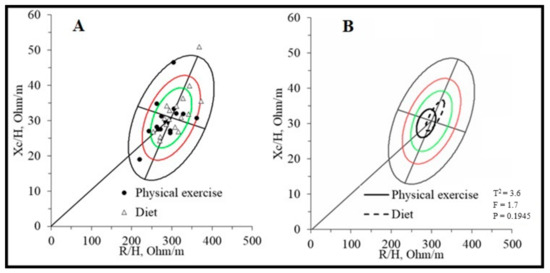Table 2 and Figure 1 compare body composition assessed with the impedance vector analysis. No significant differences between the two groups were found, even if the different positioning of the two groups on the RXc mean graph (Figure 1B) seems to be more attributable to the R component (physical exercise group = 286.6 ± 33.8 vs. diet group = 308.8 ± 33.9; p = 0.069, ES = 0.656) rather than the Xc component (exercise group = 30.1 ± 5.7 vs. diet group = 32.3 ± 6.4; p = 0.314, ES = 0.363).