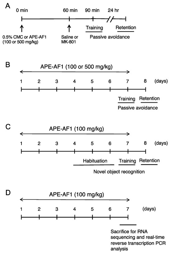 APE-AF1 was suspended in a 0.5% carboxymethyl cellulose (CMC) solution. MK-801 (Sigma-Aldrich, St. Louis, MO, USA) was dissolved in saline. The experimental design of each experiment is as described below.