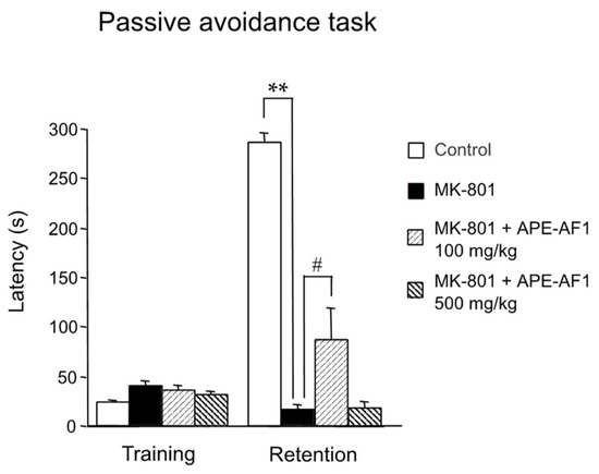 3.1. APE-AF1 Reverses MK-801-Induced Associative Memory Impairment in the Passive Avoidance Task
