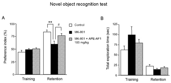 Next, we examined the effects of APE-AF1 on MK-801-induced impairment of recognition memory. Considering that the repeated treatment with 100 mg/kg APE-AF1 reversed MK-801-induced memory impairment in the passive avoidance task, APE-AF1 (100 mg/kg, p.o.) was injected once daily for 7 consecutive days before the training session of the novel object recognition test. In the training session, there were no differences in exploratory preferences for either object among the three groups (F(2,18) = 1.130, p = 0.3450) (Figure 3A). In the retention session performed 24 h after training, a decrease in exploratory preference for novel objects was evident in the MK-801-treated group, suggesting impaired discrimination of a novel object from a familiar one (F(2,18) = 5.754, p = 0.0117) (Figure 3A). Repeated treatment with APE-AF1 (100 mg/kg, p.o.) significantly reversed the MK-801-induced recognition memory impairment (Figure 3A). There was no difference in total time exploring the two objects among the three groups in the training and retention sessions (training, F(2,18) = 1.687, p =0.2130; retention, F(2,18) = 1.104, p = 0.3529) (Figure 3B).