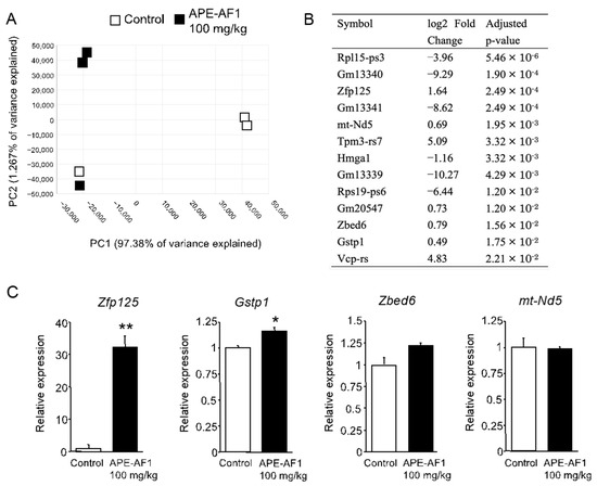 To clarify the mechanisms by which repeated treatment with APE-AF1 (100 mg/kg, p.o.) reverses MK-801-induced memory impairment, comprehensive gene expression in the hippocampi of mice treated with APE-AF1 (100 mg/kg, p.o., for 7 days) was investigated via an RNA sequencing analysis. PCA analysis showed the differences in gene expression profiles between the two groups (Figure 4A). The differential expression analysis demonstrated a total of 13 genes to be differentially expressed in the APE-AF1-treated group compared with the vehicle-treated control (Figure 4B). We measured the mRNA expression of several genes via real-time PCR. As shown in Figure 4C, the mRNA expression of Zfp125 and Gstp1 was upregulated in the APE-AF1-treated group compared with the vehicle-treated control (Zfp125, p = 0.0016; Gstp1, p = 0.0385).