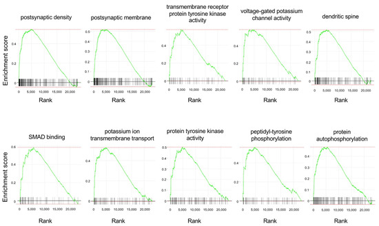 Enrichment plots of the top 10 enriched gene sets obtained using the GO database for the GSEA. Each plot shows the enrichment score against the ranked list of genes. The vertical bars on the X-axis indicate the genes belonging to the gene set.
