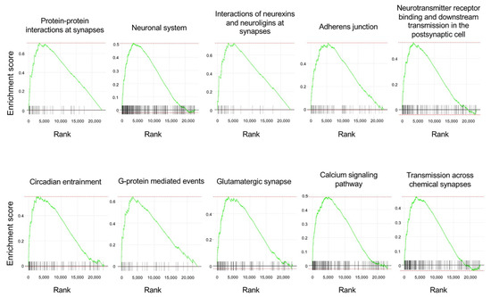The top 10 enriched gene sets and enrichment plots revealed by GSEA using the pathway database are shown in Table 2 and Figure 6. The top 100 GSEA results obtained using the pathway database are shown in Supplementary Table S3. The GSEA results revealed upregulation of multiple gene sets related to synapses and neurotransmission, such as “protein–protein interactions at synapses”, “interactions of neurexins and neuroligins at synapses”, “neurotransmitter receptor binding and downstream transmission in the postsynaptic cell”, “glutamatergic synapse”, and “transmission across chemical synapses”, in the APE-AF1-treated group compared with the vehicle-treated control, consistent with the GSEA results obtained via the GO database. These results suggest that APE-AF1 altered the expression of genes related to synapses and neurotransmission.