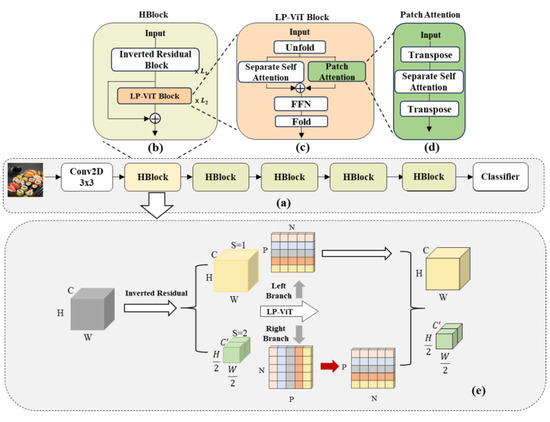 HBlock is composed of a combination of convolution and ViT, which serves as the basic module that constitutes the backbone of the entire EHFR–Net model. Among them, the convolution part uses the Inverted Residual Block proposed in MobileNetV2, and the ViT part uses the LP–ViT module proposed in this article. In HBlock, the convolution extracts local features of food images, and LP–ViT encodes global information on the local features extracted by the convolution so that the correlation information among all pixels in the feature map can be extracted. Then, local features are fused with global information through skip connection. The design method of HBlock can enable the model to quickly lock the characteristics of the ingredients in the picture and the global characteristics of the food image, improving the accuracy of the model.