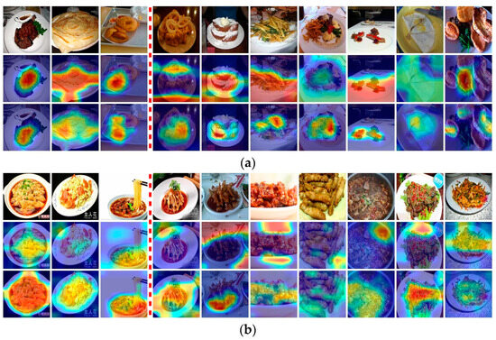 Visualization of experimental results comparison. (a): Examples from dataset Food–101 (b): Examples from dataset Vireo Food–172. The first row is the original image, the second row is the heat map without LP–ViT block, and the third row is the heat map with LP–ViT block. The first three columns both have achieved good recognition results, while in the last seven columns, only EHFR–Net is correct, and pure CNN-based method fails.