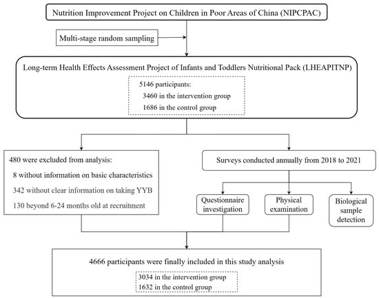 This study further excluded subjects without information on YYB consumption or on basic characteristics. Those beyond 6–24 months at recruitment were also excluded. Finally, 4666 subjects were included in the follow-up analyses. An overview of the inclusion and exclusion processes is presented in Figure 1.