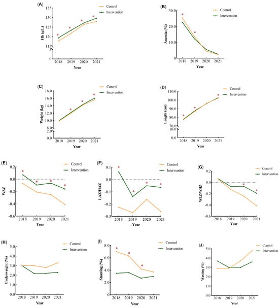 The mean change in the nutritional status of children from 2018 to 2021. The mean change in the Hb levels (A), anemia rate (B), weight (C), length or height (D), WAZ (E), LAZ/HAZ (F), WLZ/WHZ (G), underweight rate (H), stunting rate (I), and wasting rate (J) were shown at each annual visit by group. * p < 0.05.