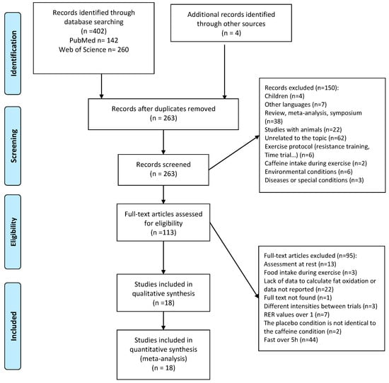 A total of 402 articles were obtained in the initial searches and 4 additional articles were found by checking the reference lists of the most relevant articles. After removing duplicates, 263 studies were selected for title and abstract review. By reading the title and abstracts, 150 studies were subsequently excluded because they (a) included children as the study sample (n = 4); (b) the exercise protocol was not appropriate for the meta-analysis because they used resistance exercise or time trials with free-chosen exercise intensity (n = 6); (c) were not written in English (n = 7); (d) included animals as a sample of the study (n = 22); (e) did not assess fat oxidation rate in an exercise context (n = 62); (f) the intake of caffeine was during exercise (n = 2); (g) were carried out under special environmental conditions like cold or hot environments (n = 6); (h) included participants with chronic conditions or diseases (n = 3); or (i) were review articles, meta-analyses, and conferences (n = 38). A total of 113 full-text articles were assessed for eligibility by application of inclusion/exclusion criteria and 95 studies were excluded for different reasons: (a) the assessment of fat oxidation rate was before or after exercise, with no measurement during exercise (n = 13); (b) participants ingested food or drinks during exercise (n = 3); (c) there were not enough data to calculate fat oxidation rate during exercise (e.g., only RER value was reported; n = 22); (d) the exercise intensity did not match between caffeine and placebo conditions (n = 3); (e) there was an RER value above 1.0 (n = 7); (f) the full text was not found (n = 1); (g) the placebo condition was not identical to the caffeine condition (n = 2); or (h) participants were fed more than 5 h before exercise (i.e., they were in a fasted state) (n = 44). After this process, only 18 studies published between 1982 and 2021 were included in the qualitative and quantitative analysis. A summary of this process is presented in Figure 1.