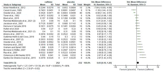 A total of 20 caffeine–placebo comparisons on fat oxidation rates during fed-state exercise were obtained from the 18 articles included in this systematic review. This is because two articles included two comparisons, one study comparing two different doses of caffeine to the placebo condition [47] and one study comparing caffeine and placebo at two different times of the day [60]. Figure 2 shows the overall effect of acute caffeine intake on fat oxidation rate during exercise in the fed state with these 20 placebo–caffeine comparisons. The pre-exercise intake of caffeine increased fat oxidation rate during exercise with respect to the placebo (p = 0.02), with an SMD of 0.65 and 95% CI from 0.10 to 1.20.