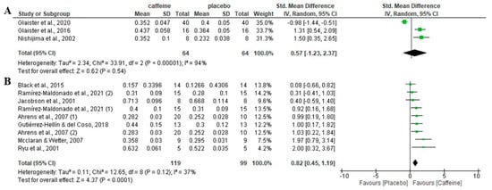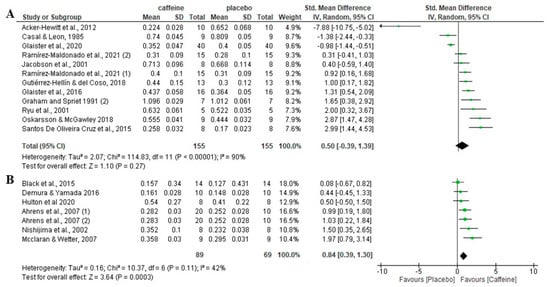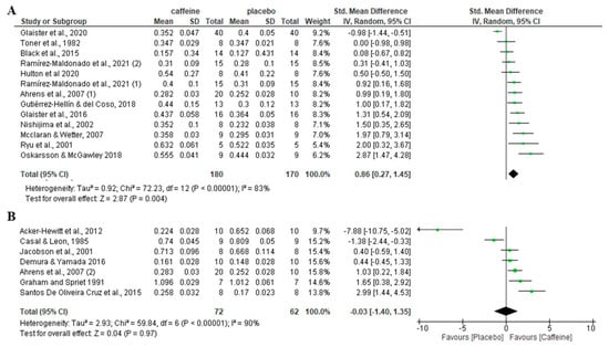 Caffeine was administered in capsules in 12 studies [46,47,48,51,52,53,54,56,57,58,59,62] and in powder form dissolved in fluids in 6 studies [49,50,55,60,61,63]. Caffeine was administered between 30 and 120 min before the onset of exercise, although a 60 min ingestion before exercise was the most common timing for caffeine administration. The dose of caffeine administered was quantified according to the participant’s body mass in most studies, ranging from 3 to 9 mg of caffeine per kilogram. In the remaining studies, an absolute dose of 400 mg [49], 350 mg [63], or 300 mg [58] was administered. In these studies, the mean of the body weight was used to quantify the dose of caffeine as mentioned in the methods section. Hence, from the total 18 studies, there were 6 studies with a caffeine dose of 6 or more mg/kg (≥6 mg/kg) [46,49,50,53,56,62]; in 11 studies, the dose of caffeine was less than 6 mg/kg (<6 mg/kg) [48,51,52,54,55,57,58,59,60,61,63]. One study used two different doses of caffeine, corresponding to 3 and 6 mg/kg [47], and data from this study were used separately for both s, respectively.